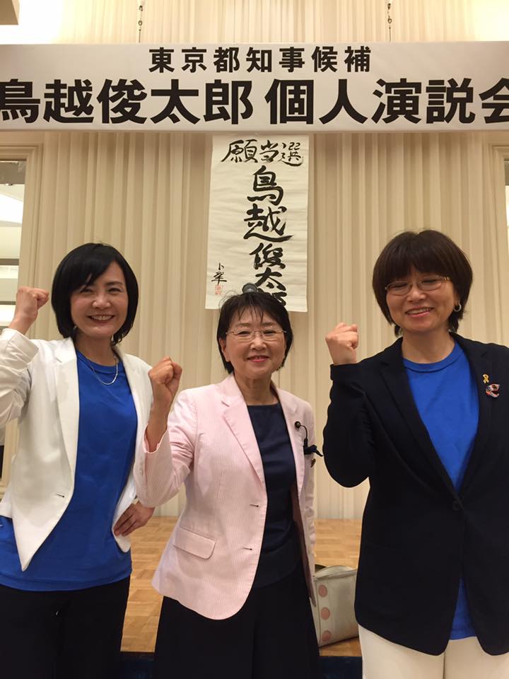 左から本西みつえ江戸川区議、小松久子、伊東ひとみ江戸川区議 鳥越俊太郎個人演説会で 7/25