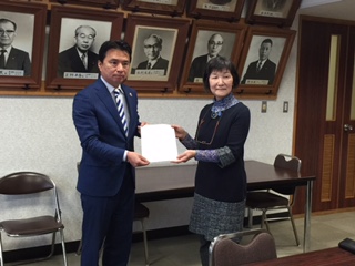 2016年2月24日、小金井・生活者ネットワークはこの2路線計画見直しを西岡市長(左)に促す要請を行った。右は小金井市議の田頭祐子さん